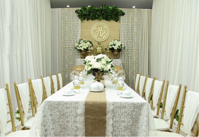 Trang trí ghế: Để tăng thêm vẻ đẹp cho không gian, bạn có thể treo những bó hoa nhỏ trên lưng ghế hoặc dùng hoa tươi để trang trí giữa các bàn ghế.